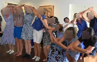 舞の体の扱い方には日本古来の物事の捉え方が生かされています。そこを実感頂くと驚きの声や歓声が飛び交い、舞って頂く部分の体験では「キツイ」「難しい」との声がちらほら聞えながらも皆さん真剣に集中なさって、最後には一曲舞い切ることができました。